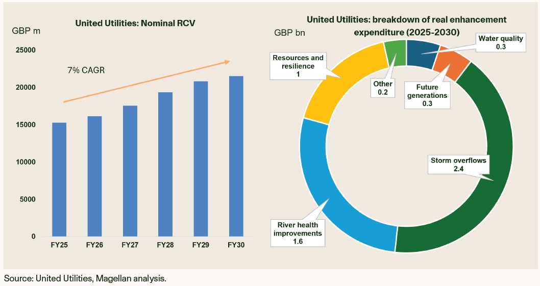 These listed water utilities are instrumental in delivering the government’s planned investment overhaul. In the current regulatory period (2025-2030), Severn Trent guides to 60% growth in its Regulated Capital Value (RCV or RAB) while United Utilities expects >40% growth in its RCV over the same period.