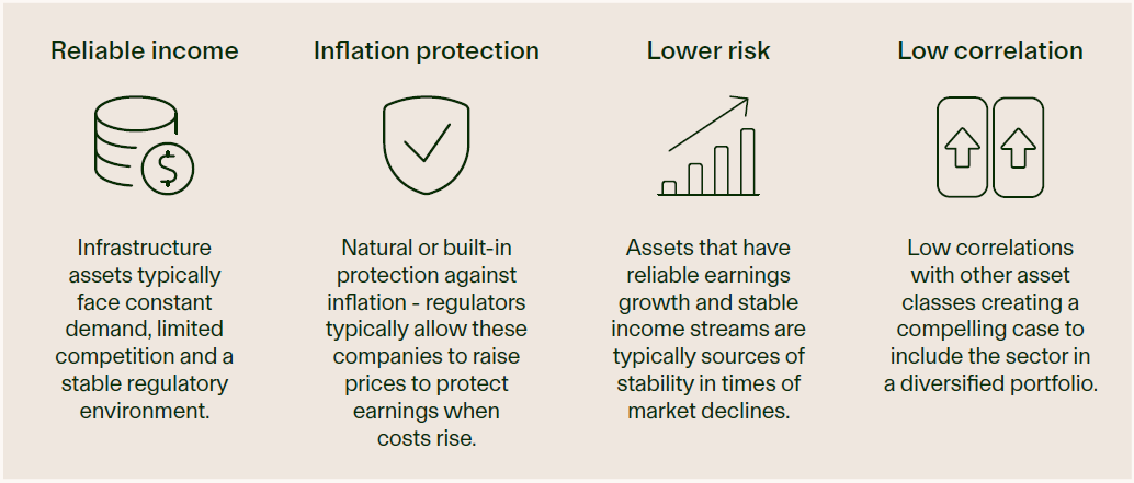 As investments, infrastructure stocks exhibit unique characteristics, including reliable cash generation, inflation protection, defensiveness in declining markets, and low correlations with other asset classes creating a compelling case to include the sector in a diversified portfolio.